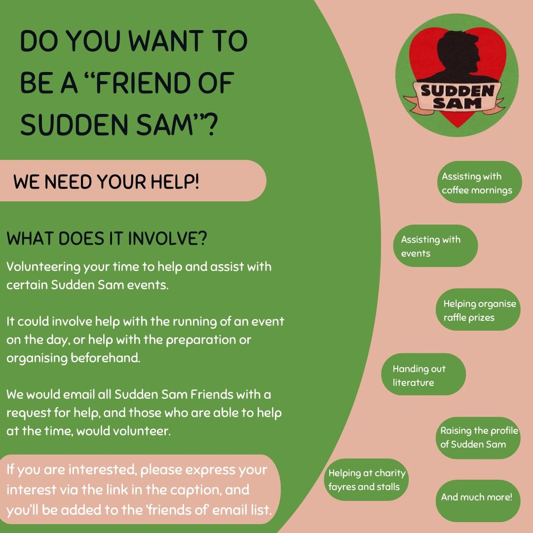 In order for as many people as possible to be positively impacted by Sudden Sam, we require kind donations of, not only monetary contributions, but also time.